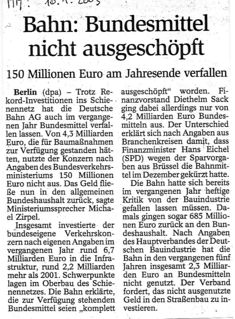 Im Jahr 2003 sind 150 Mio EUR an Hätte die Stadt Starnberg seinerzeit in 2001 Gepräche mit der Bahn zu Gunsten des Seetunnels geführt, dann wären diese Mittel wohl für Starnberg zur Verfügung gestanden und der komplette Seetunnel Bahn hätte auf ganzer Länge finanziert werden können. Stattdessen haben die damaligen Akteure der Stadt Starnberg mehrere hundertausend Euro an Steuergeldern in “Gefälligkeitsgutachten” zum Abwürgen des Projekts verschwendet! Schon in der Schule gilt, wer nie den Finger hebt, wird auch nie aufgerufen. |